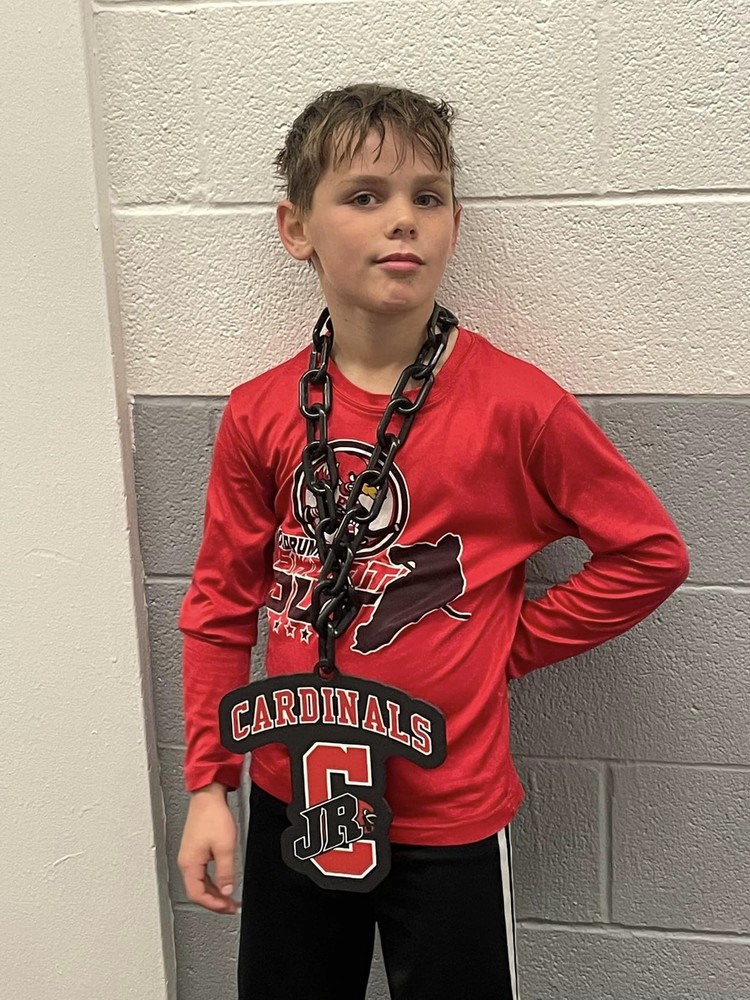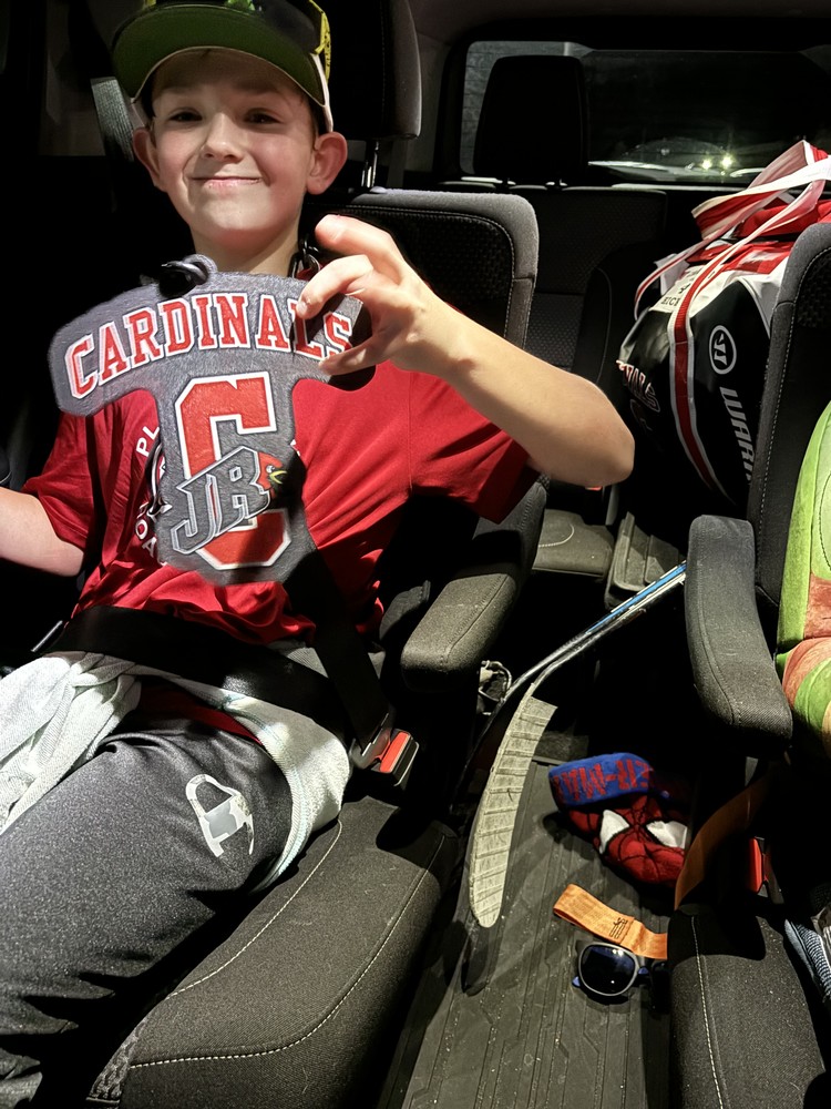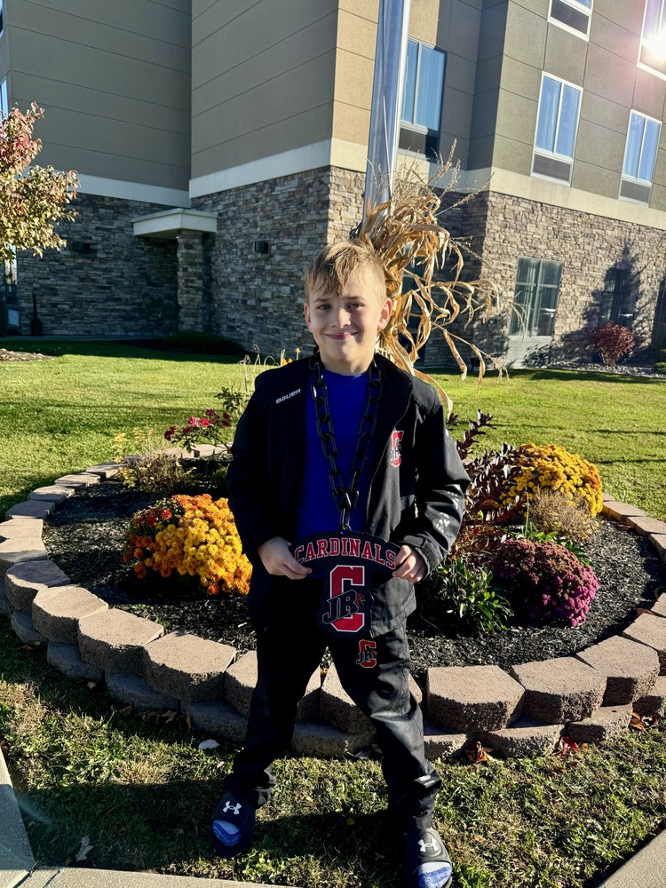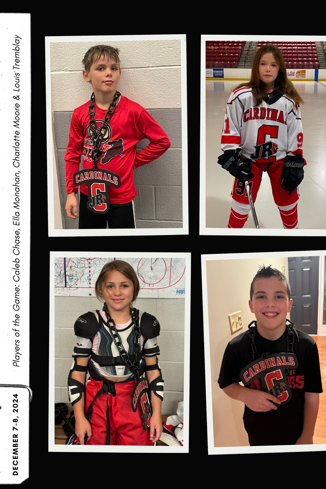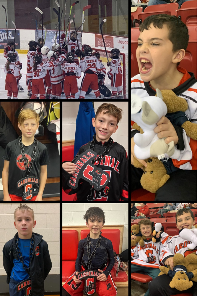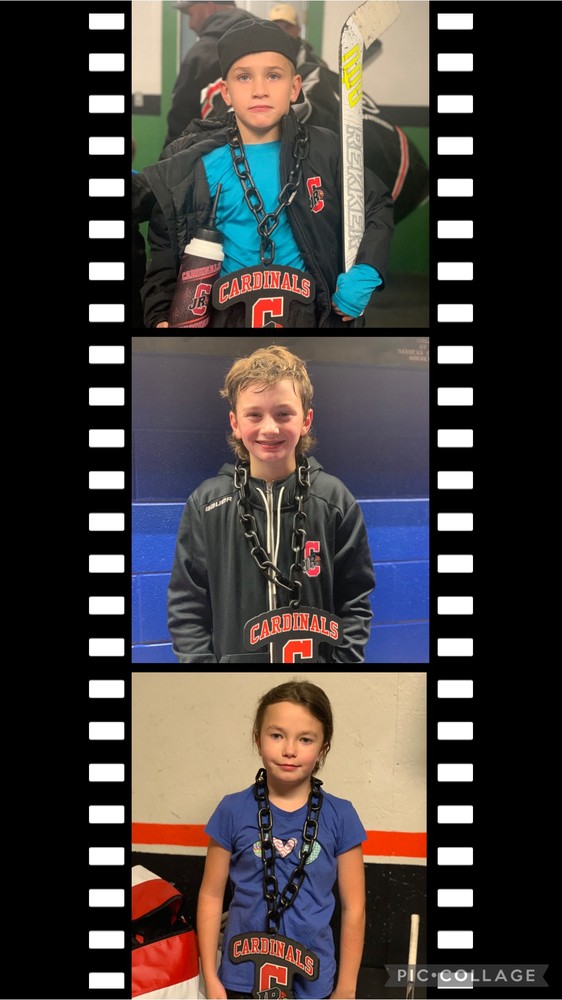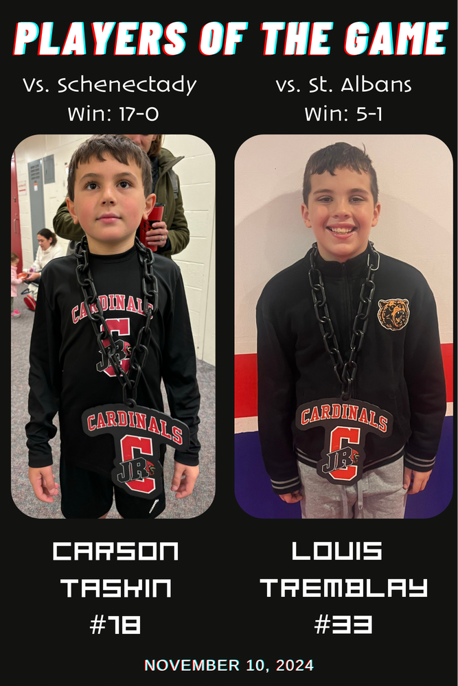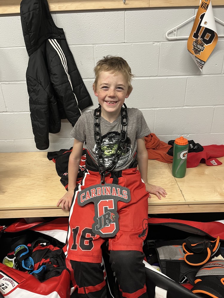 Player of the game Brody VanNederynen chosen by Ella Monahan. Brody had a great game full of hustle! Stole the puck from Blue Knight’s defense to score his 1st goal of the season unassisted and got the monkey off his back. Brody also had a sweet pass to Louis Tremblay who sniped it post and in to give the Jr. Cardinals a 2-1 lead in the 2nd period. All the Jr. Cardinals played great and pulled out a squeaker to win 3-2.