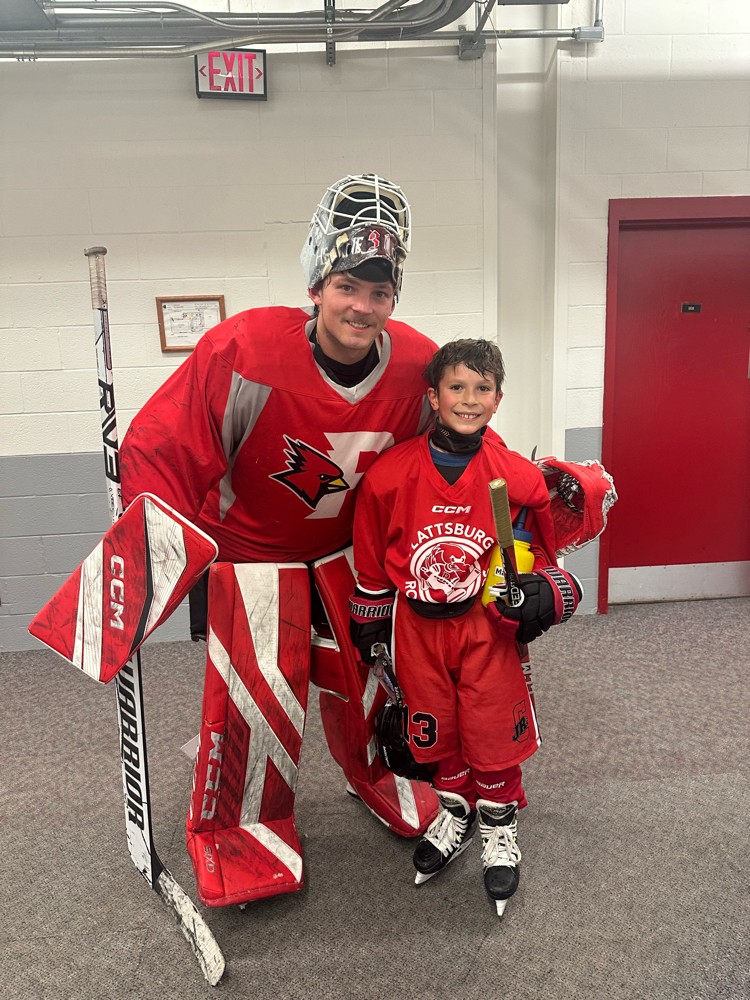 Max Rabideau and the rest of the team got an extra special surprise when they practiced with the men's Cardinal hockey team tonight! Pic of Max hanging with Goalie Jacob Hearne, who averaged a .928 save percentage last year. Mike drop.